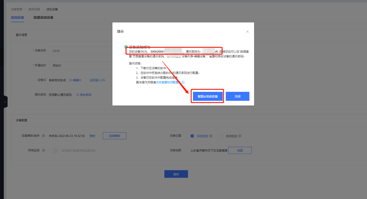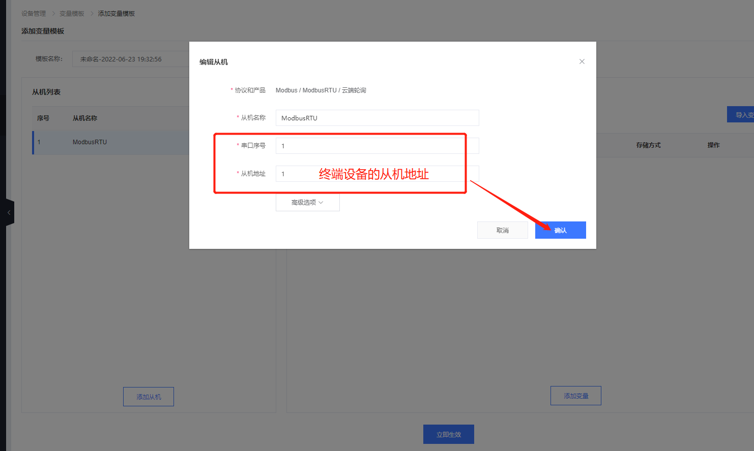 6.添加從機,設置從機名稱,串口號為1,從機地址是接在WIFI模塊的串口上的終端設備的從機地址(如果不清楚,可以咨詢終端設備的廠家)。