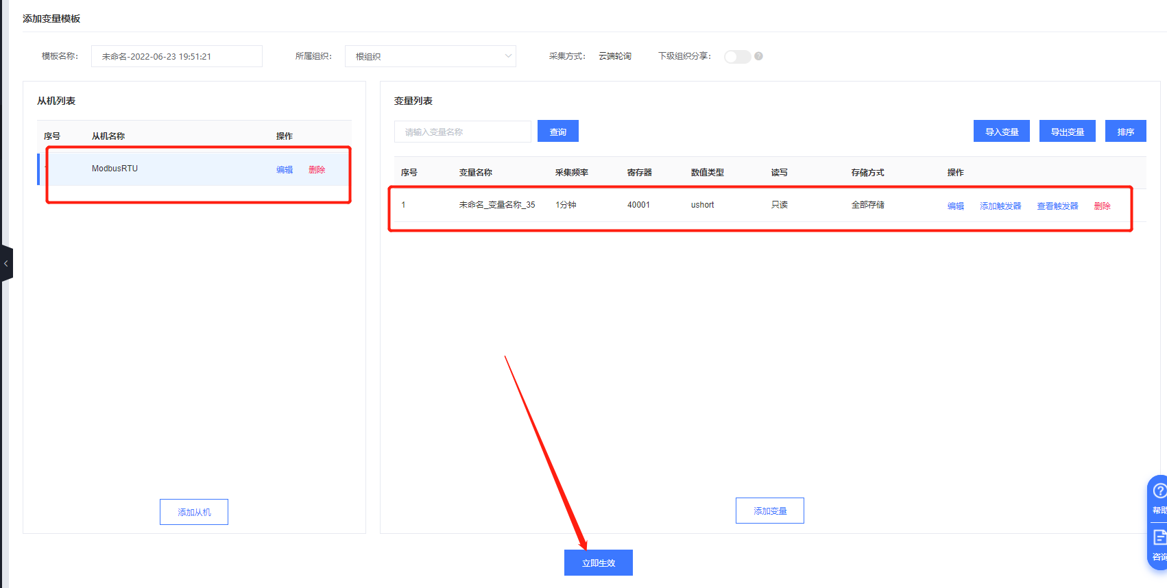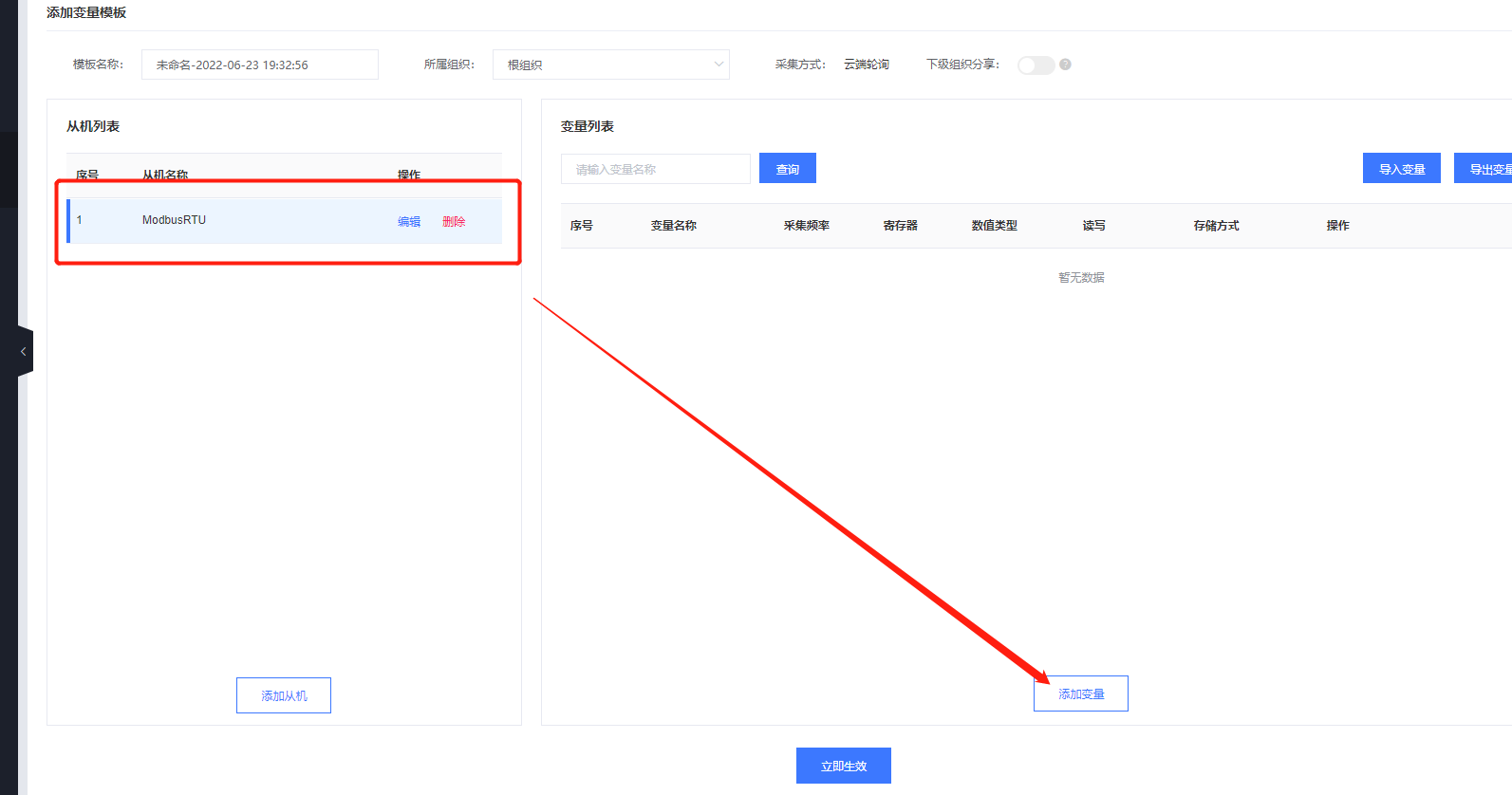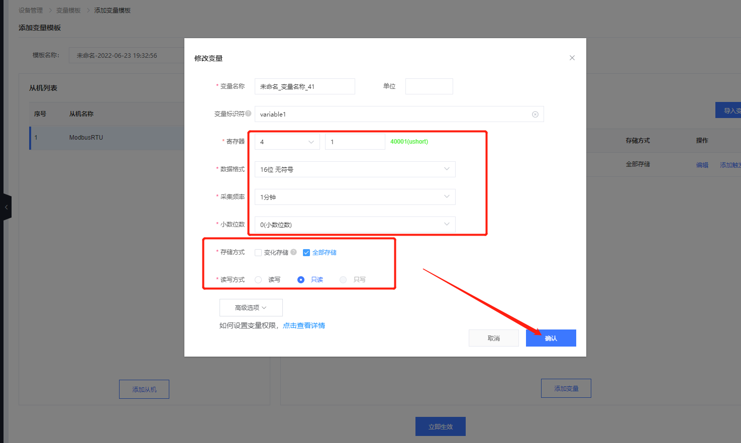7.添加變量,設置數據節點的名稱,寄存器地址,數據格式,采集頻率(最低只能是一分鐘);