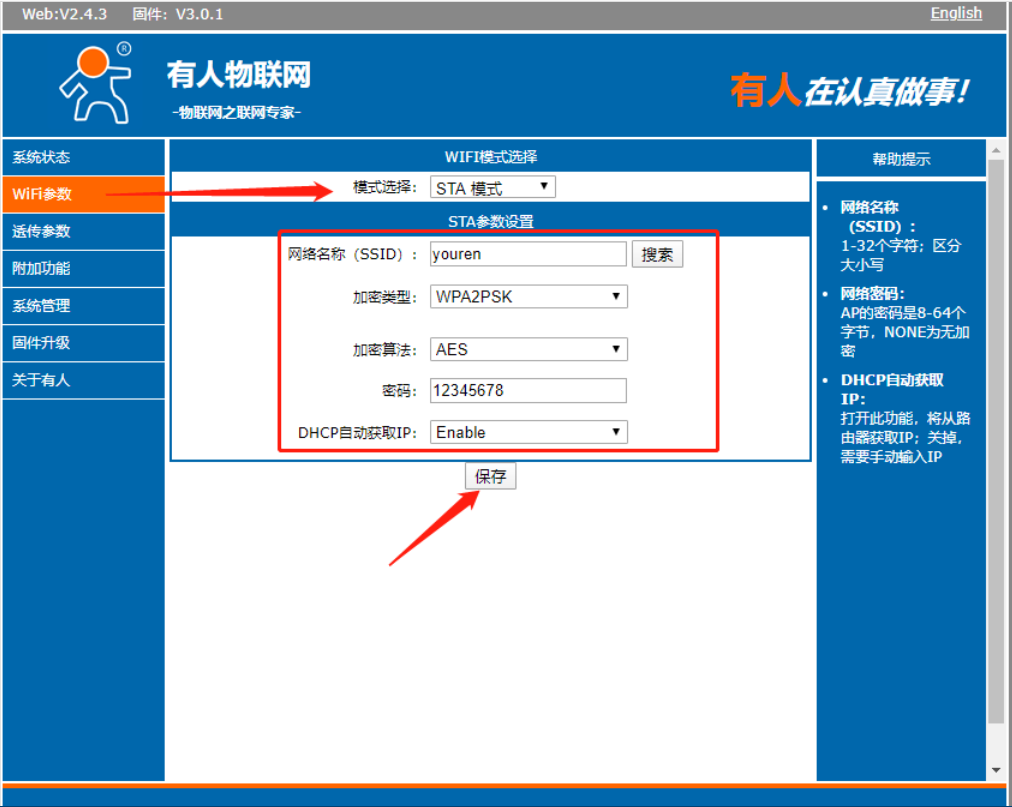 10.內置網頁的賬號和密碼都是admin,進入以后選擇模式選擇模式選擇為sta模式,設置要連接的wifi名稱、加密類型、算法、密碼,點擊保存;(先不要重啟,等設置完所有的參數再重啟設備)。