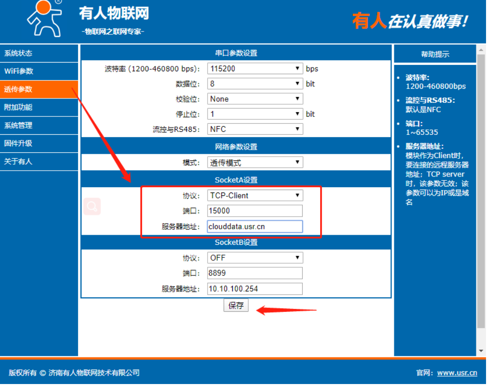 11.進入到“透傳參數”,串口參數設置為和您終端設備的串口參數一致。網絡設置上設置為Tcp Client,有人云的域名為clouddata.usr.cn,有人云的端口為15000,設置完點擊保存。