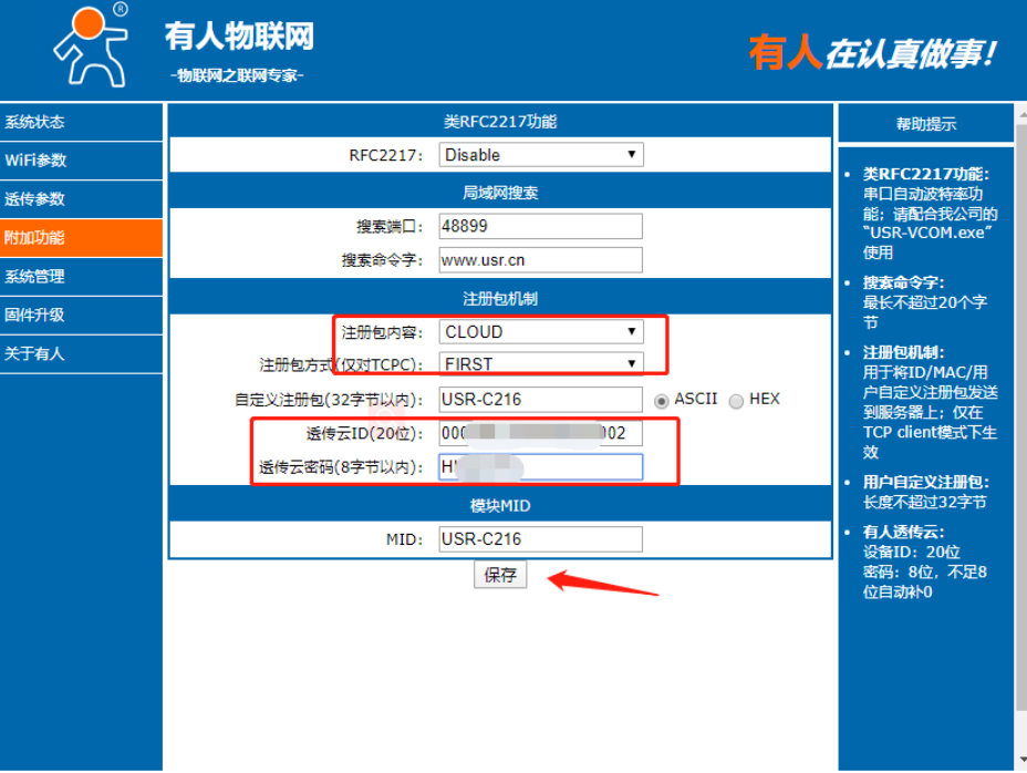 12.進入附加功能,注冊包選擇有人云,填上有人云上新建立的設備id,和密碼(如下圖所示),點擊保存