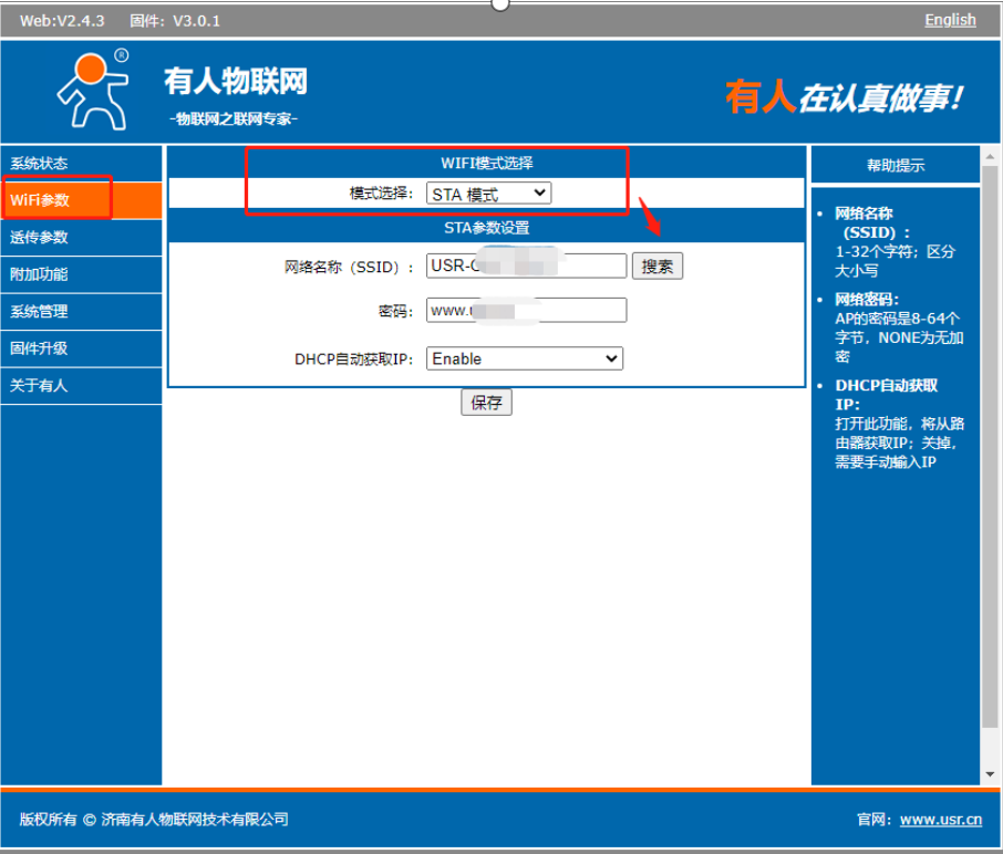 3>在WIFI參數(shù)里面選擇STA模式,搜索現(xiàn)場(chǎng)2.4Gwifi(密碼不可以有中文特殊字符)點(diǎn)擊保存,暫時(shí)不重啟