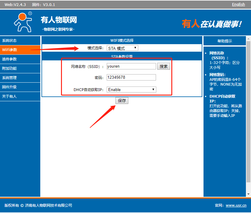 16、內置網頁的賬號和密碼都是admin,進入以后選擇模式選擇模式選擇為sta模式,設置要連接的wifi名稱、加密類型、算法、密碼,點擊保存;(先不要重啟,等設置完所有的參數再重啟設備)