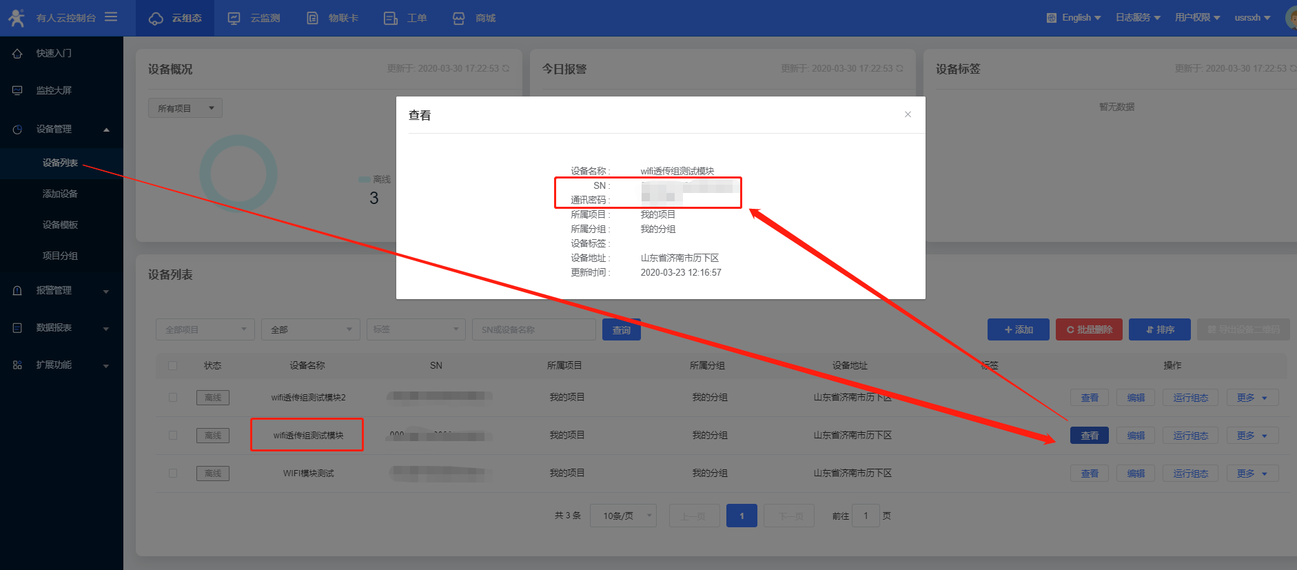 20、依據第14~15步,讓第二個wifi模塊入網,第二個模塊的設備ID與通訊密碼填寫位透傳云模塊2的SN與密碼,配置完模塊重啟, 第二個模塊在云端顯示上線。