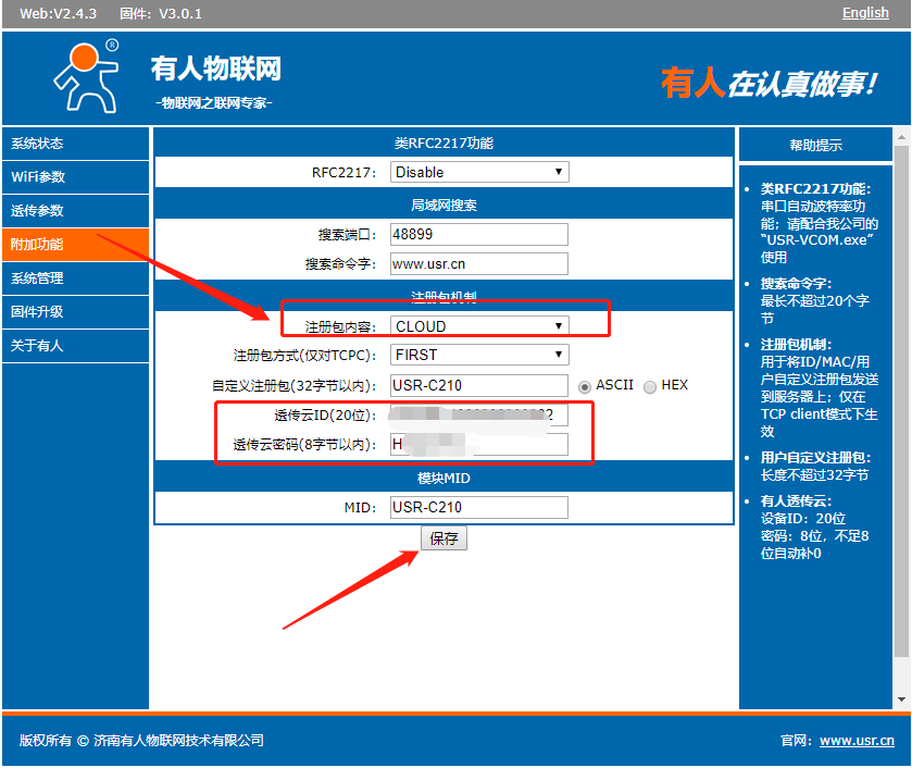18、進入附加功能,注冊包選擇透傳云,填上透傳云上新建立的設備id,和密碼(如下圖所示),點擊保存。