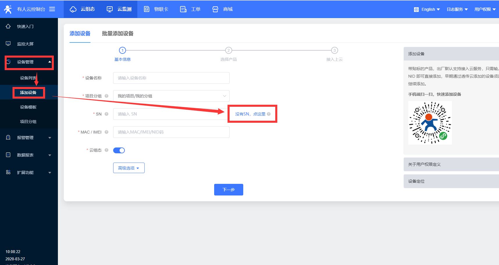 1、登陸云平臺后,在 設備管理》添加設備 中添加一個設備,點擊框后面的藍字“沒有SN”