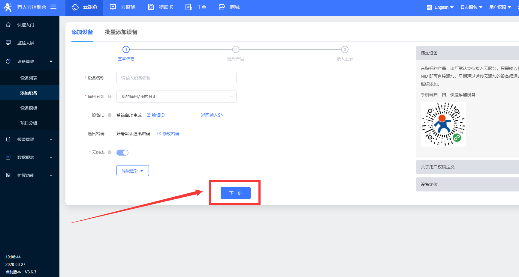 2、填寫好對應的信息,設備id通訊密碼不用設置由系統自動生成即可,直接點擊下一步