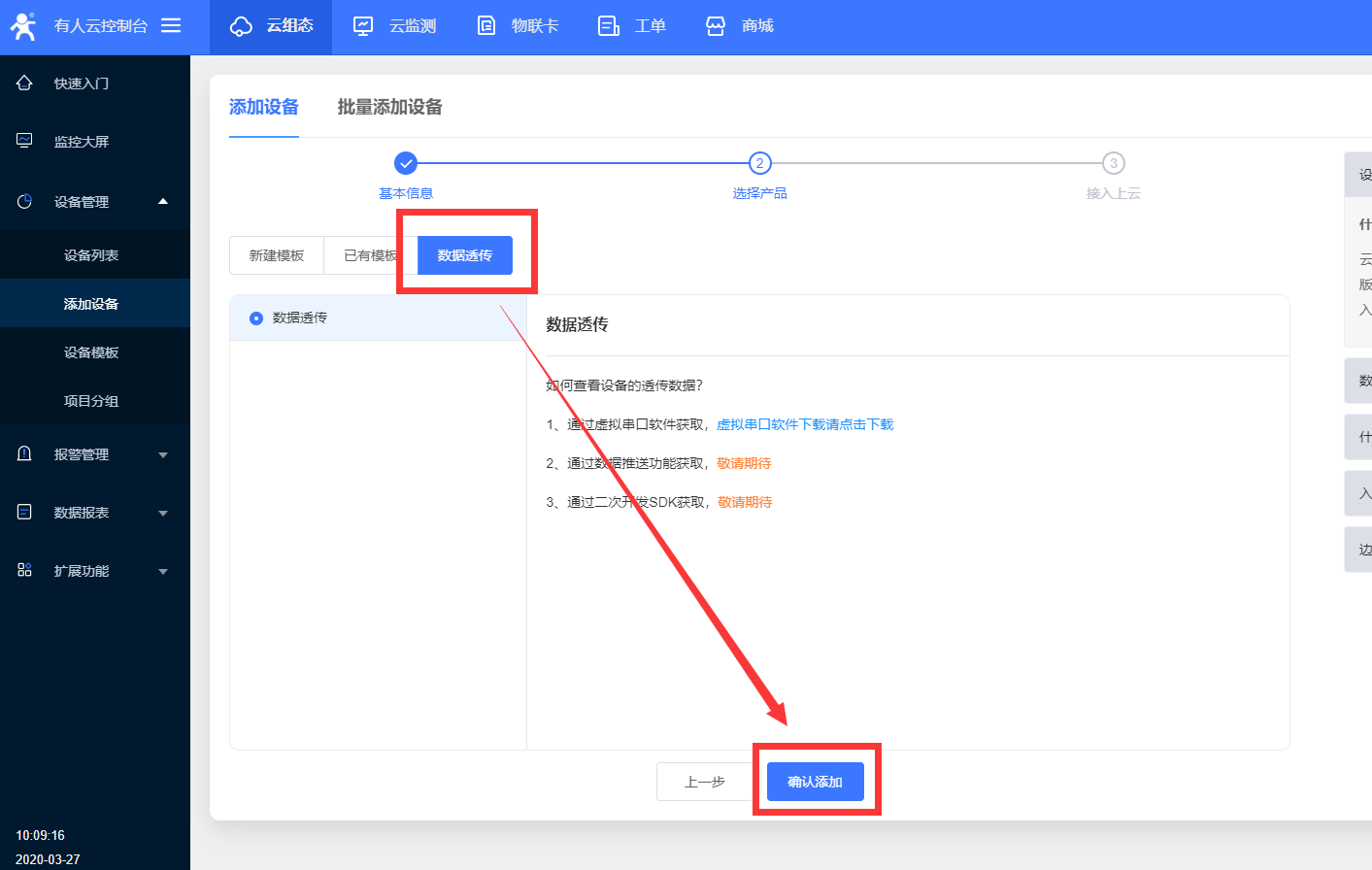 3、選擇協議這里,選擇“數據透傳”后確認添加