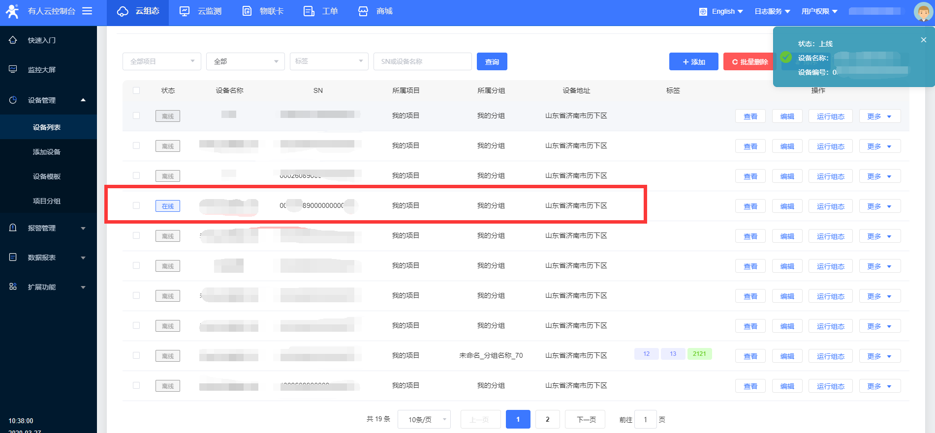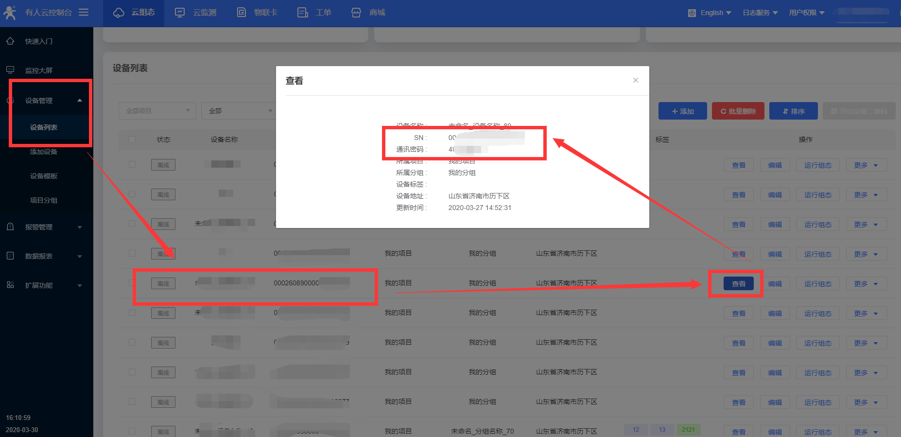 4、在設備管理》設備列表 可以看到添加的設備,點擊后面的查看,可以看到設備生成的編號及通訊密碼