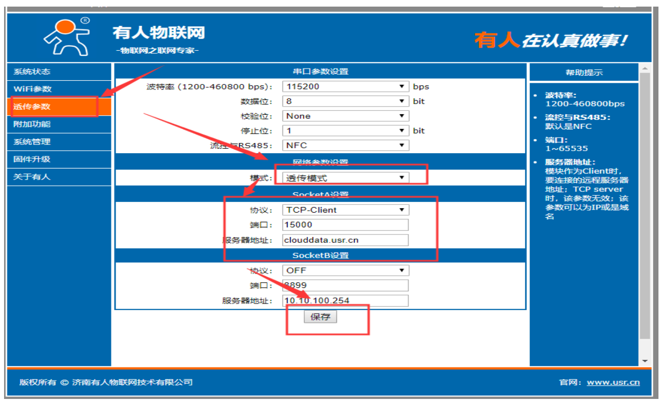2、進入內置網頁(10.10.100.254)內置網頁的賬號和密碼都是admin。進入透傳參數,選擇透傳模式,服務器地址:clouddata.usr.cn端口15000,保存