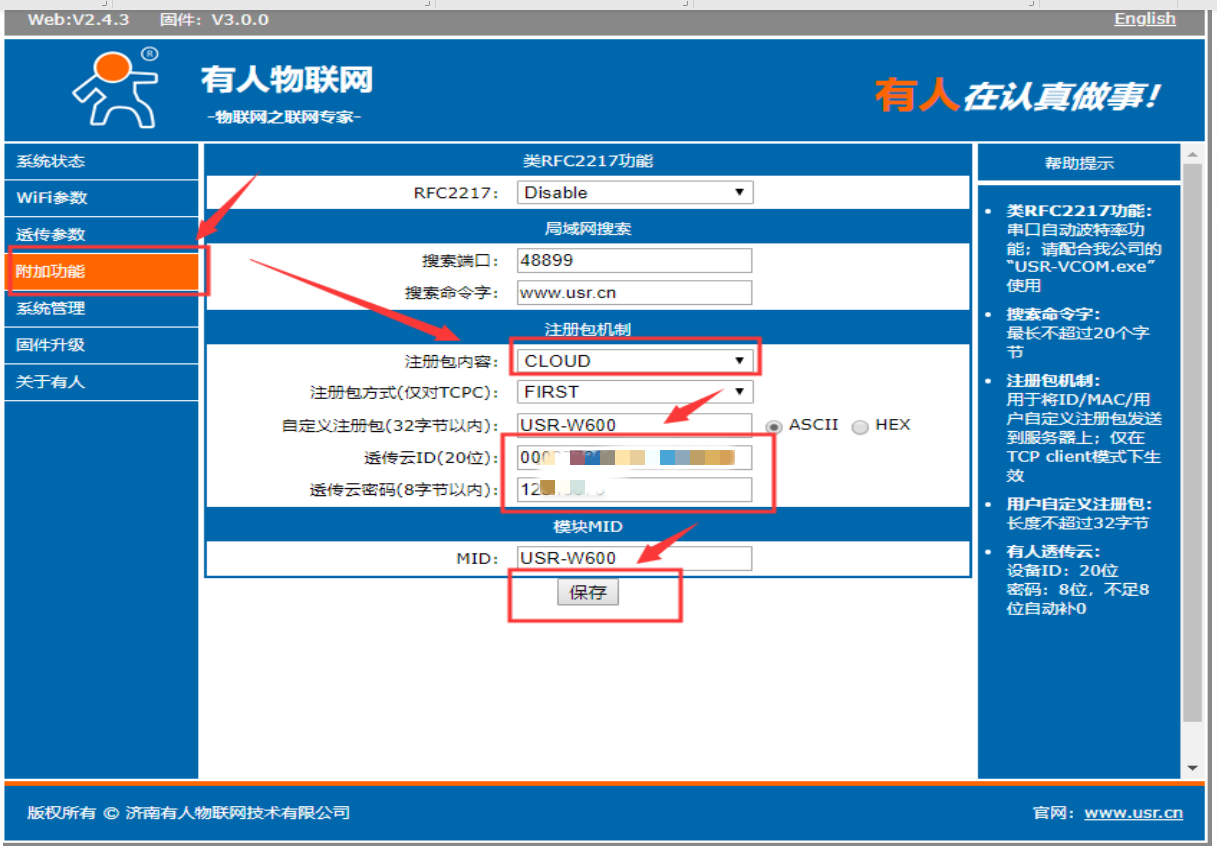 3、進入附加功能,注冊包內容:cloud,填上剛才在有人云上新添加的設備的編號,和密碼,點擊保存
