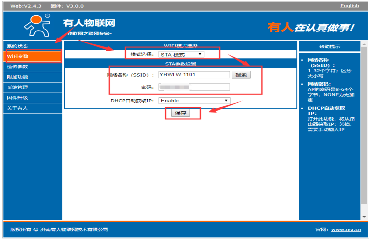 4、在wifi參數,進入以后選擇模式選擇模式選擇為sta模式,點擊確定,先不要重啟,等設置完所有的參數再重啟設備