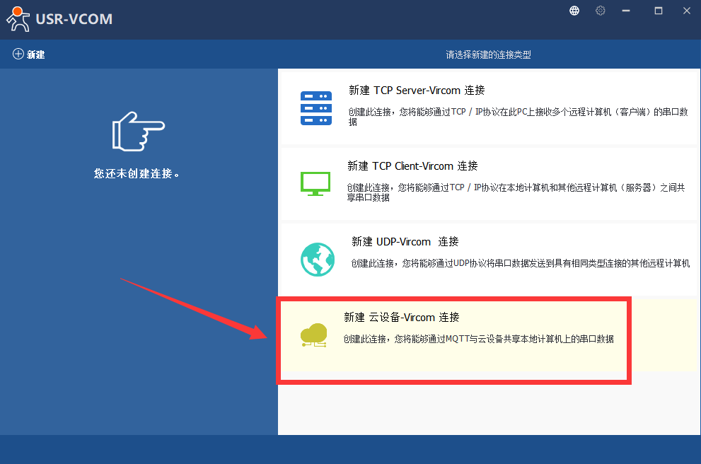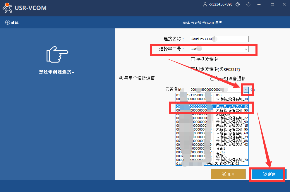 3、選擇一個不常用的串口號,選擇云端剛才添加的設備,點新建,生成設備對應的虛擬串口