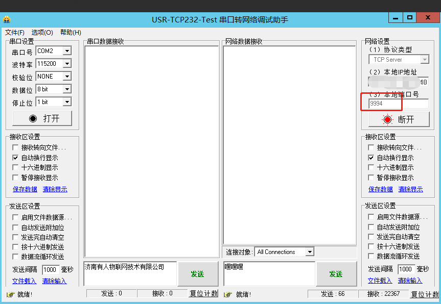 1. 先在4G無線傳輸終端的服務器端打開一個網絡調試助手,設置成TCP server及本地端口號(在該案例中我設置的是9999),開始監聽