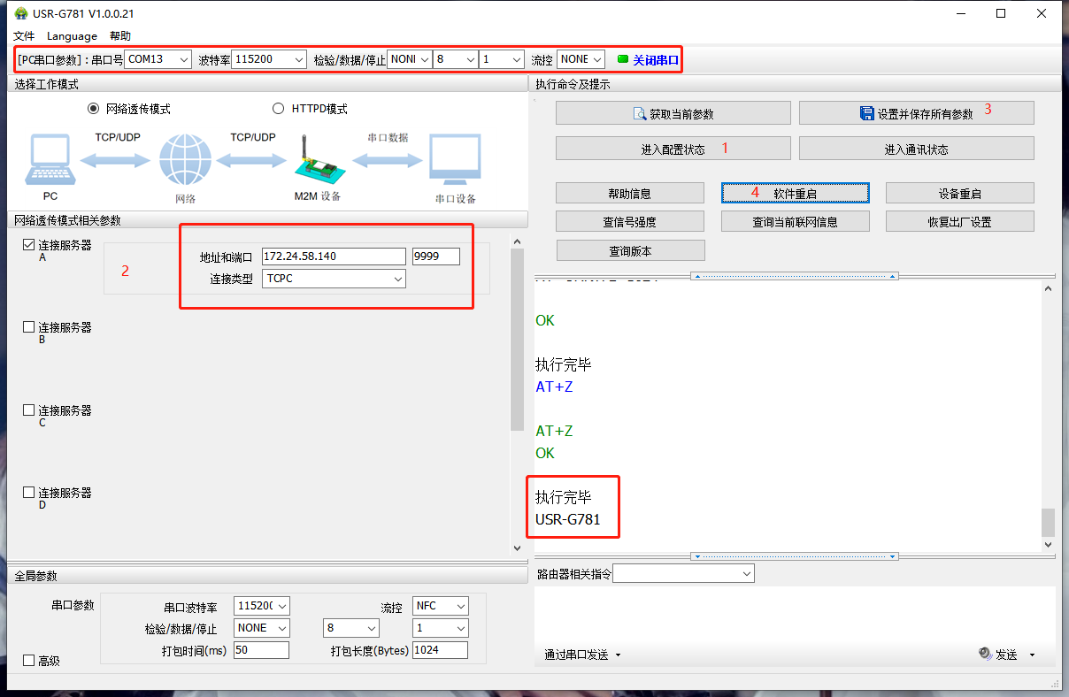 打開串口--->進入配置狀態--->成功的話,會返回執行完畢--->勾選連接服務器A,修改服務器地址和端口--->設置并保存參數--->軟件重啟或者設備重啟(軟件重啟速度要快一些),重啟后,可以看到LINKA指示燈常亮