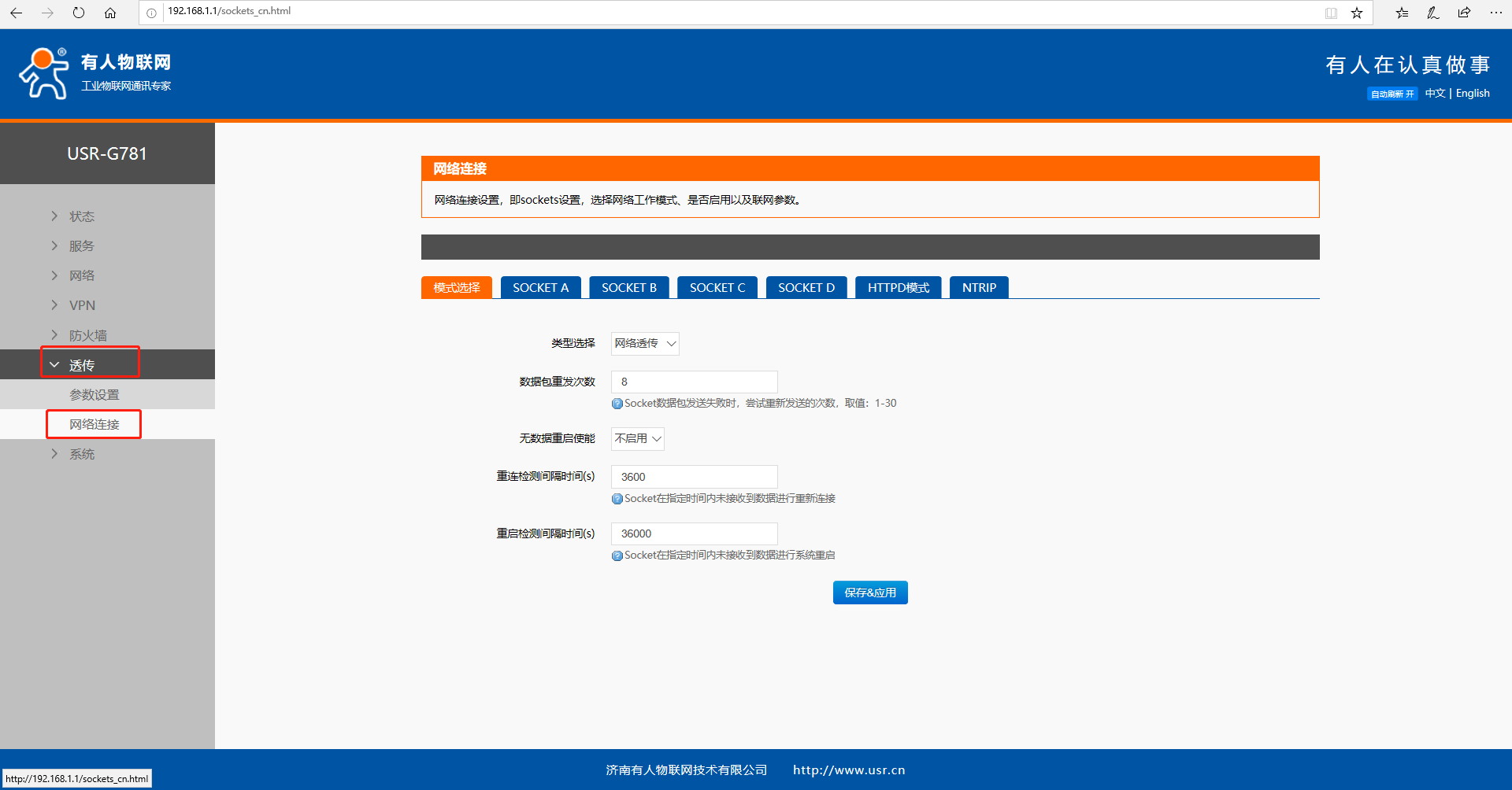 在內置網頁--透傳--網絡連接中設置參數