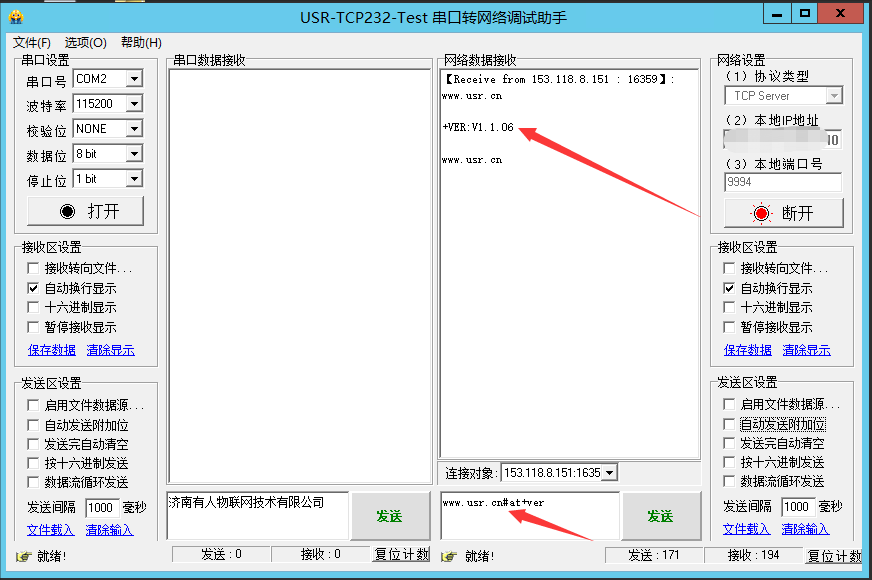 3.在遠程服務器端輸入www.0575400.com#at+ver加回車(注:回車必須加,若不加回車會返回錯誤警告),點擊發送,會返回781的固件版本號。(網絡at指令使用的是命令密碼+at指令的方式。命令密碼默認狀態下是www.0575400.com#。若您忘記了命令密碼,可以通過at指令AT+CMDPW來查詢命令密碼)