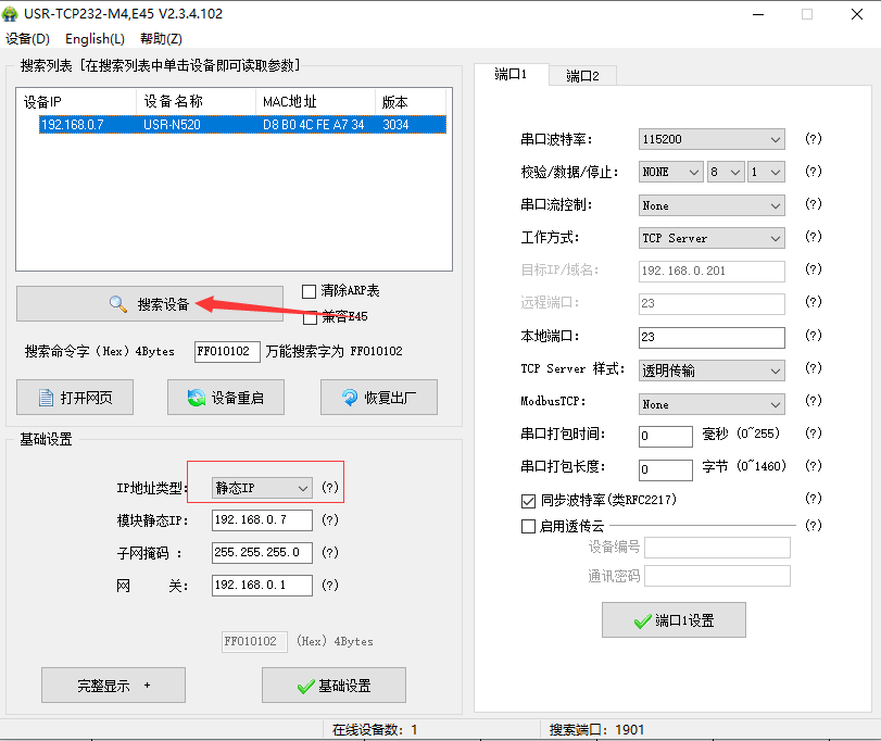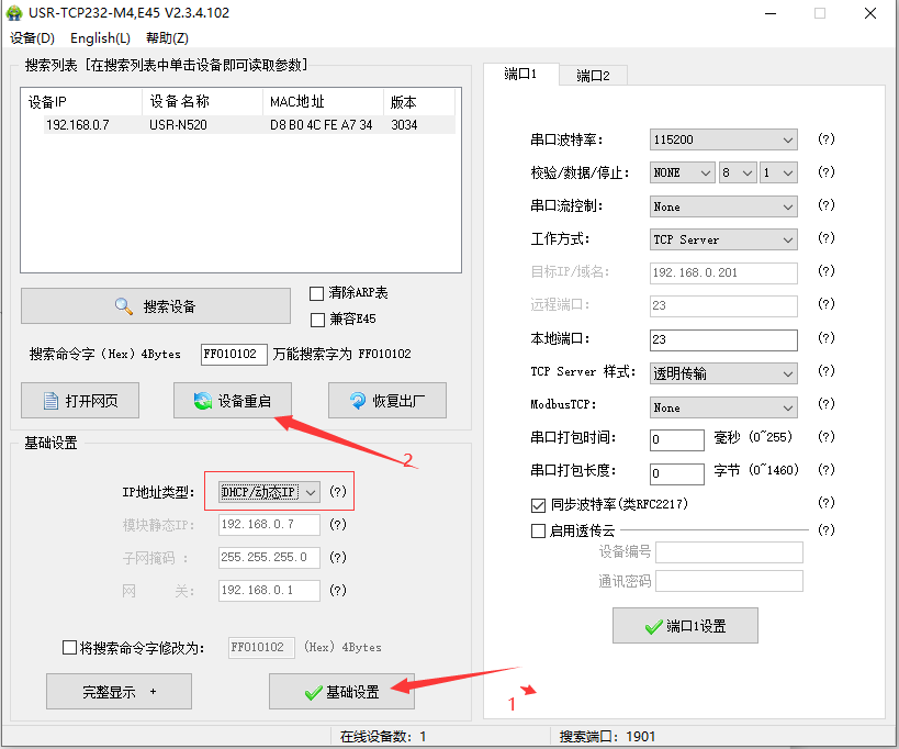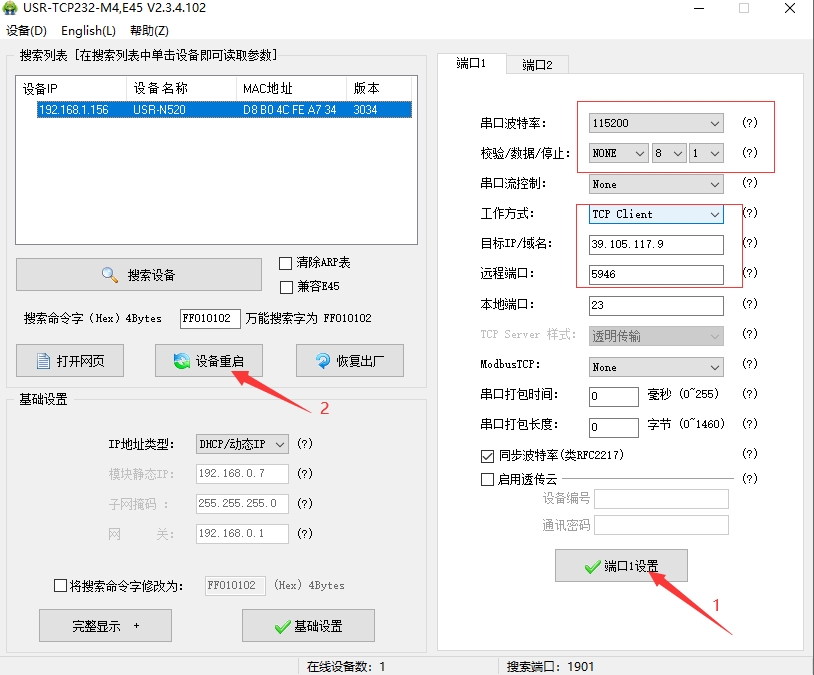 4.修改服務器地址和端口--->端口1設置--->設備重啟。這里填寫的為我自己服務器的ip,端口為臨時創建的端口,用戶在使用時不可以依照次ip與端口來進行配置,需要連接自己服務器的ip與端口。
