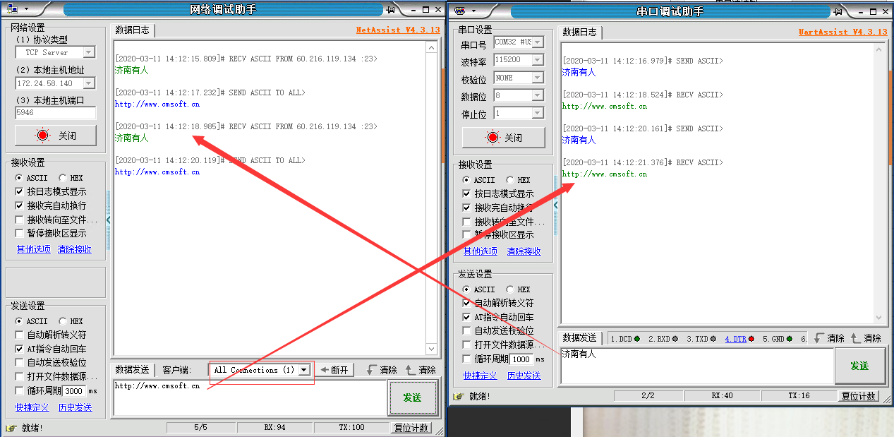 3.重啟后進行通信測試,測試結果如下圖所示。可以看到數據收發都是正常的。