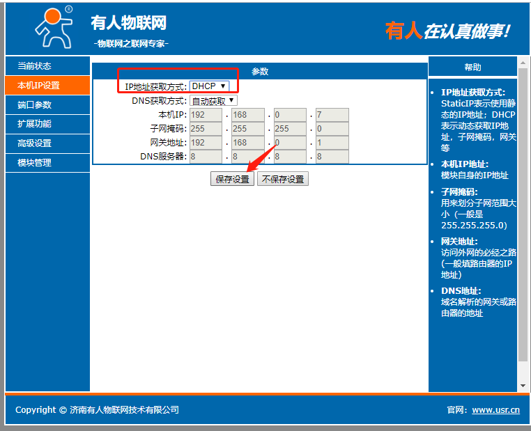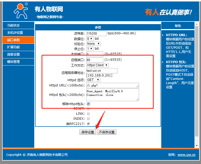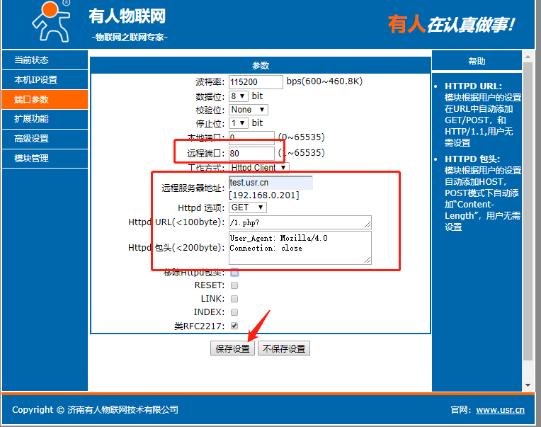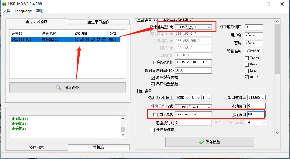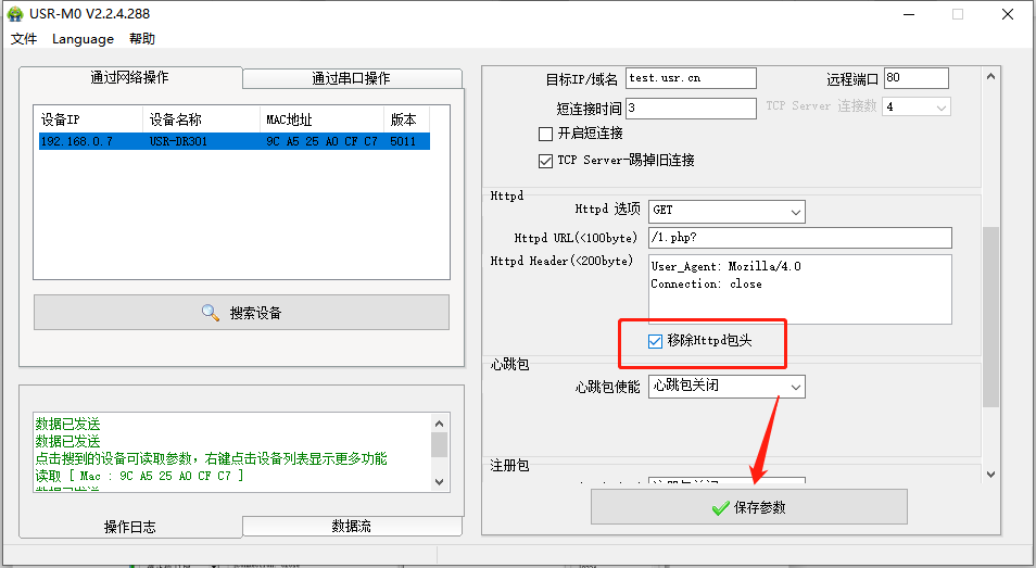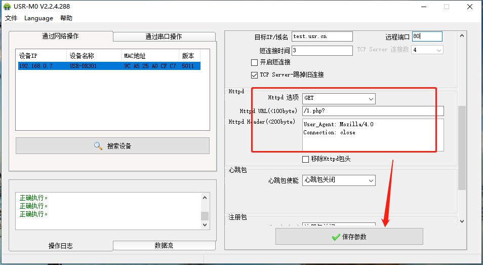 點擊“搜索設備”當搜索列表中出現301的設備后,單擊搜索到的設備,IP設置為DHCP,模塊設置為Httpd Client模式,請求方式GET,URL為/1.php?,設置服務器地址test.usr.cn,端口80,設置并保存所有參數,重啟模塊。(本說明文檔使用為有人測試服務器)