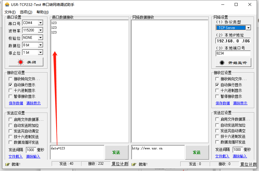 打開正確的串口以及串口參數,本例串口參數是301的默認參數:115200,N,8,1