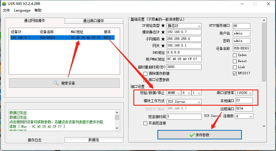 點擊“搜索設(shè)備”當搜索列表中出現(xiàn)301的設(shè)備后,單擊搜索到的設(shè)備,查看其配置信息,協(xié)議類型選擇TCP Server,本地端口可隨意設(shè)置,只要不是特殊端口或重復端口即可,本例以23為例。設(shè)置完成后重啟設(shè)備,參數(shù)需要重啟生效。