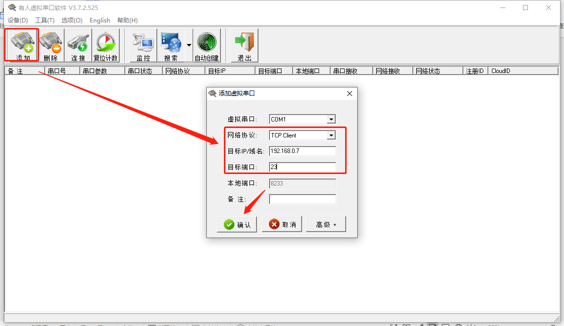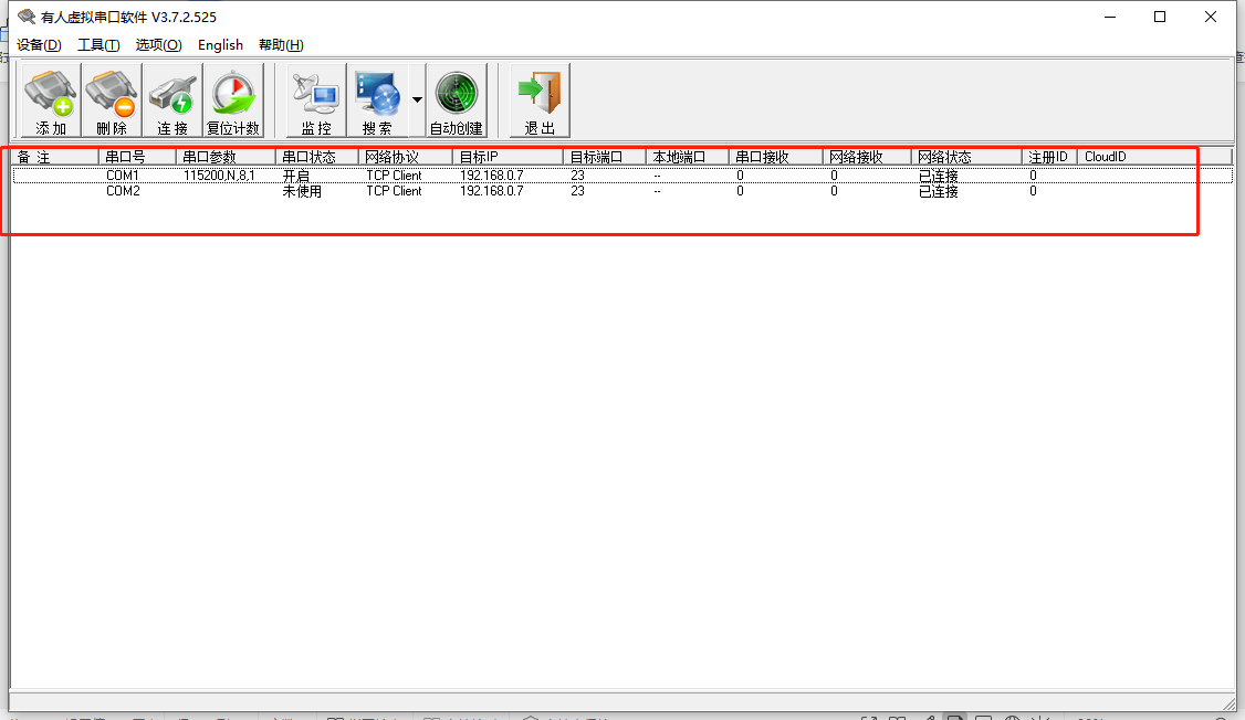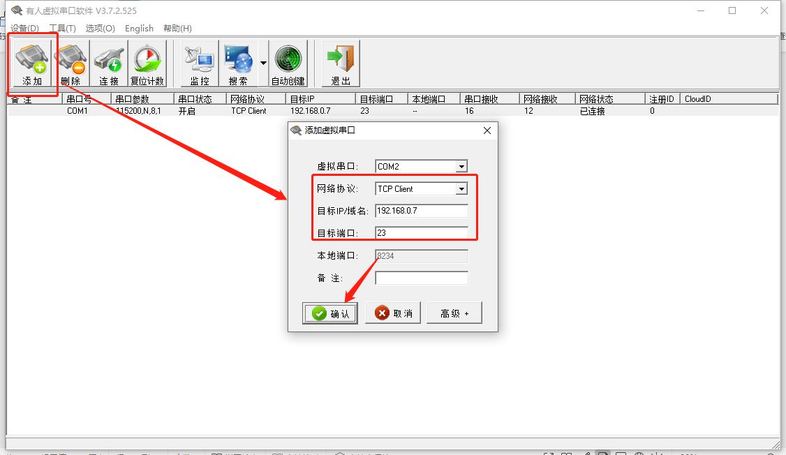 7、打開虛擬串口軟件,點擊“添加”,添加一個新的虛擬串口COM2,協(xié)議類型選擇TCP Client,目標IP為301的默認IP:192.168.0.7,目標端口為301的本地端口:23,填寫完成后點擊確定。可以看到新添加的虛擬串口顯示已連接。