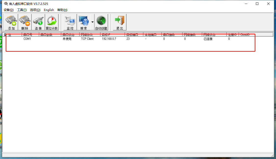 點擊“添加”,添加一個新的虛擬串口COM1,協(xié)議類型選擇TCP Client,目標IP為301的默認IP:192.168.0.7,目標端口為301的本地端口:23,填寫完成后點擊確定。可以看到新添加的虛擬串口顯示已連接。