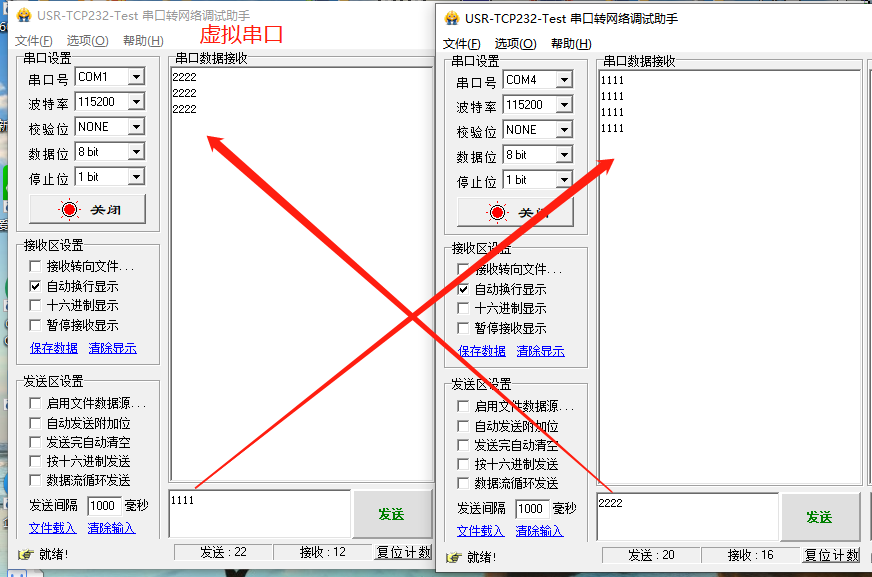 打開兩個串口調(diào)試助手,分別選擇正確的串口以及串口參數(shù),互發(fā)數(shù)據(jù),可以分別看到數(shù)據(jù)的接收。