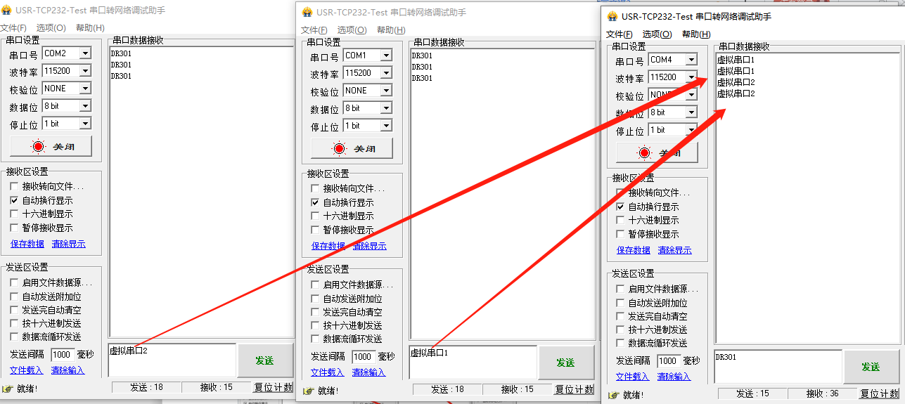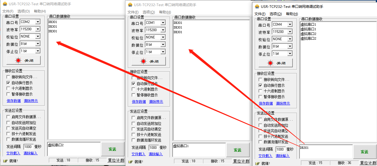 打開三個串口調(diào)試助手,分別選擇正確的串口以及串口參數(shù),互發(fā)數(shù)據(jù),可以分別看到數(shù)據(jù)的接收。