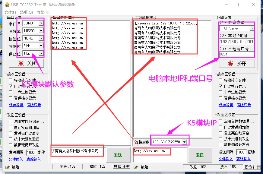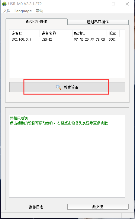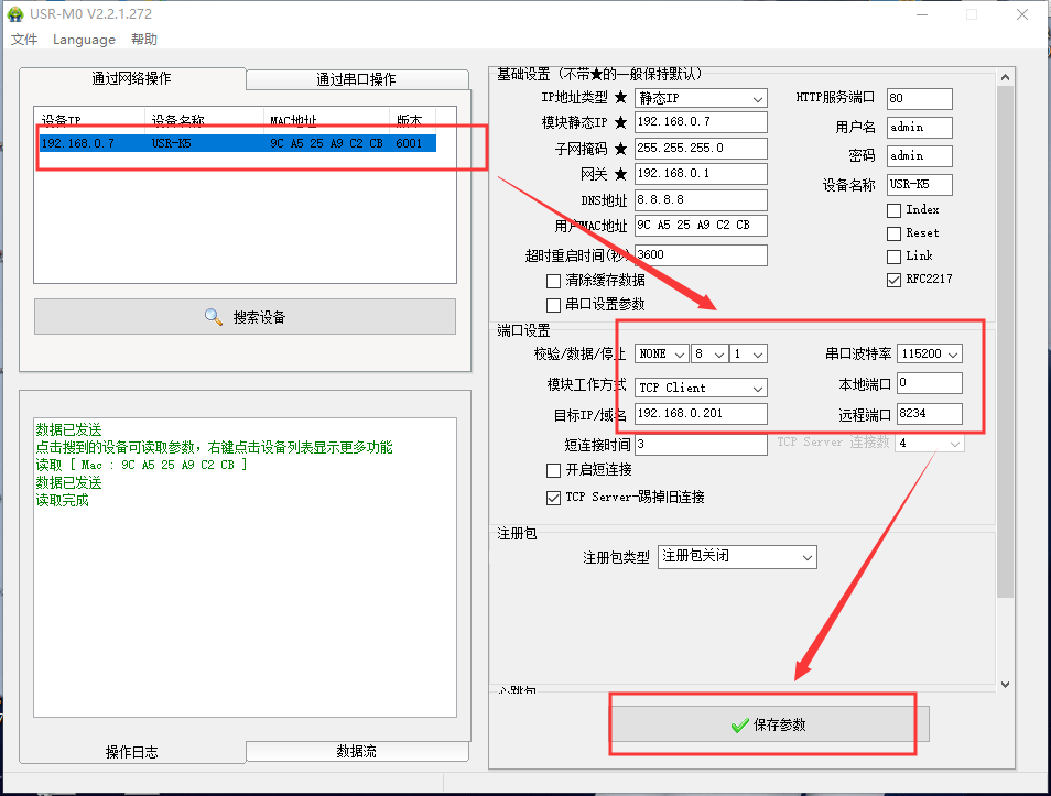 3.打開設(shè)置軟件,點(diǎn)擊“搜索設(shè)備”當(dāng)搜索列表中出現(xiàn)K5的設(shè)備后,單擊搜索到的設(shè)備,查看其配置信息,工作方式選擇TCp Client,目標(biāo)ip為pC的本地Ip:192.168.0.201,遠(yuǎn)程端口為pC的本地端口號:8234
