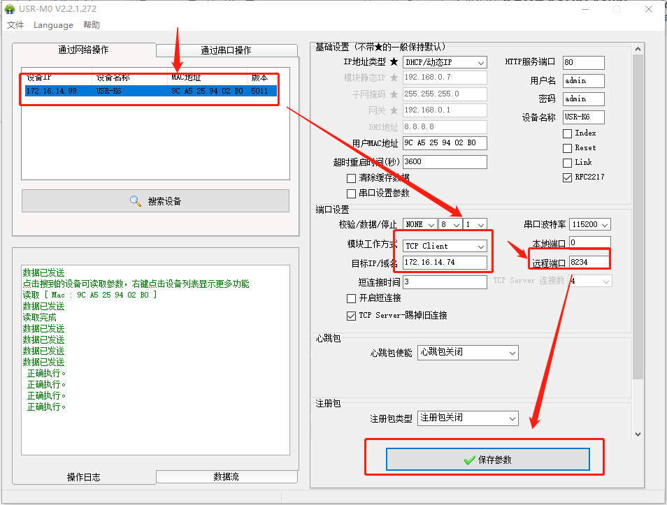 點(diǎn)擊“搜索設(shè)備”,當(dāng)搜索列表中出現(xiàn)K6的設(shè)備后,單擊搜索到的設(shè)備,設(shè)置配置信息并保存(動(dòng)態(tài)IP),工作方式選擇TCP Client,目標(biāo)ip為虛擬串口IP:172.16.14.74,遠(yuǎn)程端口為虛擬串口的本地端口號(hào):8234
