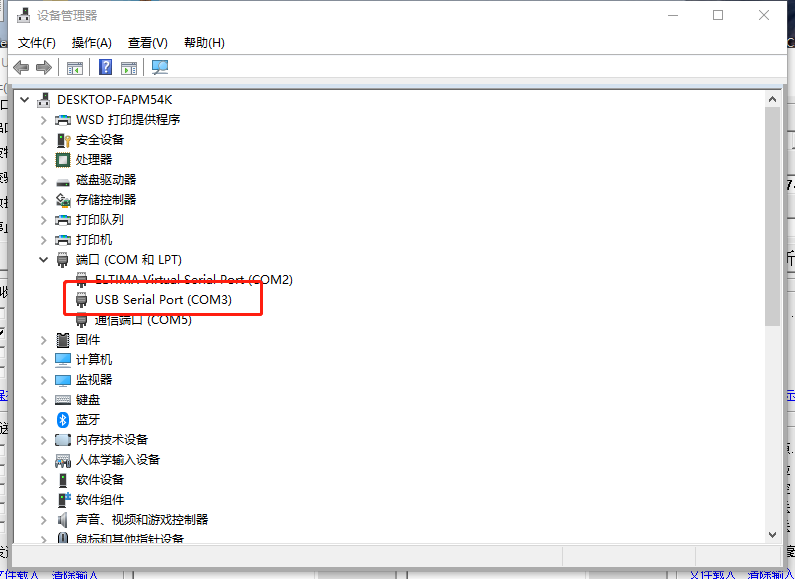 在設(shè)備管理器中查看端口信息,確定K6串口使用的串口號(hào),如下圖所示電腦端口號(hào)為COM3