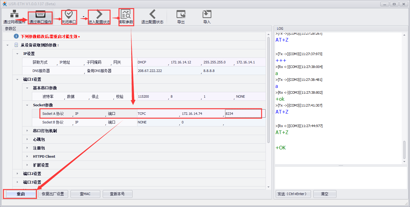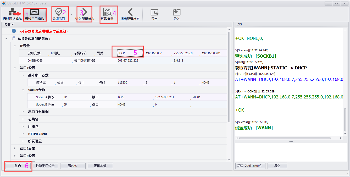 2.打開N668設置軟件,點擊“通過串口操作”——“打開串口”——“進入配置狀態”——“讀取參數”,設置動態獲取IP