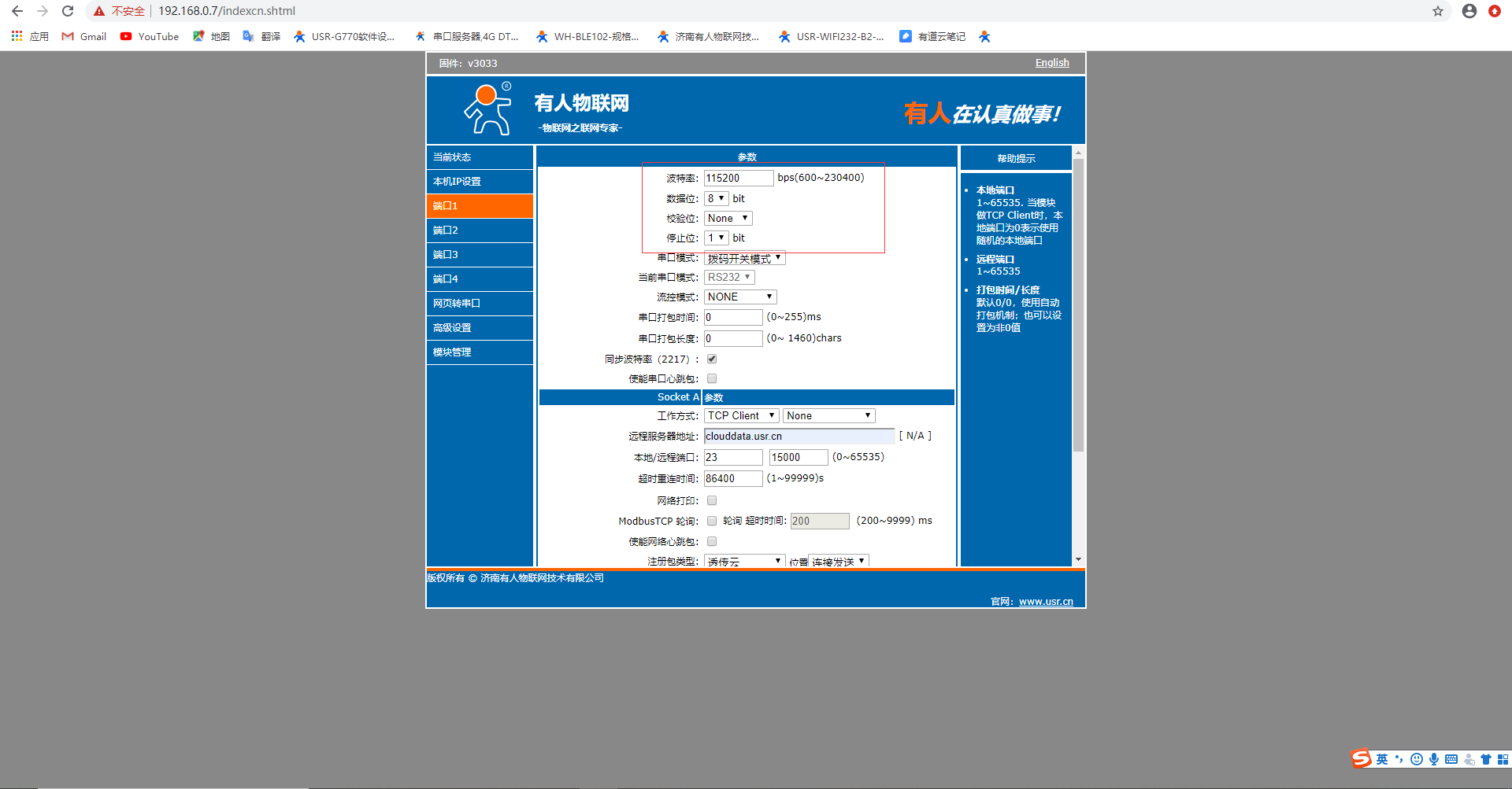 6.工作方式選擇TCp Client,遠程服務器地址:clouddata.usr.cn,遠程端口:15000,本地端口不要設置為0,默認即可