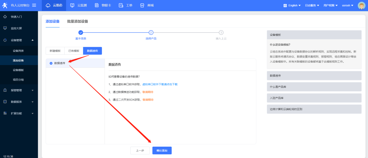 5、本次案例是兩個C215連有人云進行數據透傳,選擇添加設備;