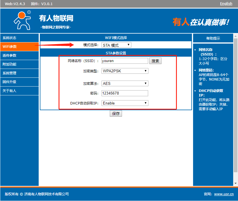 16、電腦瀏覽器地址欄輸入模塊默認ip:10.10.100.254,登入模塊的內置網頁,賬號和密碼都是admin,進入以后選擇模式選擇模式選擇為sta模式,設置要連接的wifi名稱、加密類型、算法、密碼,點擊保存;color:#ff0000;font-size:10.5000pt;mso-font-kerning:1.0000pt;background:#ffff00;mso-highlight:#ffff00;">(先不要重啟,等設置完所有的參數再重啟設備)