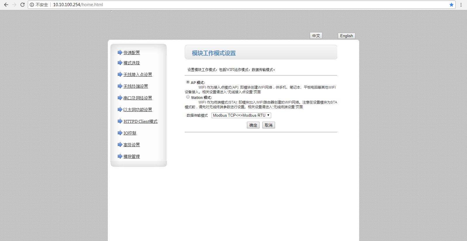 網頁上設置Ap模式,開啟MODBUS TCp轉MODBUS RTU模式。串口及網絡設置,設置串口參數。MODBUS輪詢設置開啟,時間設置5000ms。網絡模式設置TCp server,端口8899。