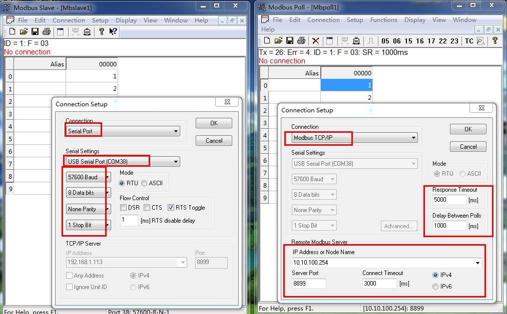 打開MODBUS SLAVE軟件,用COM38打開,串口參數和B2模塊設置一致。