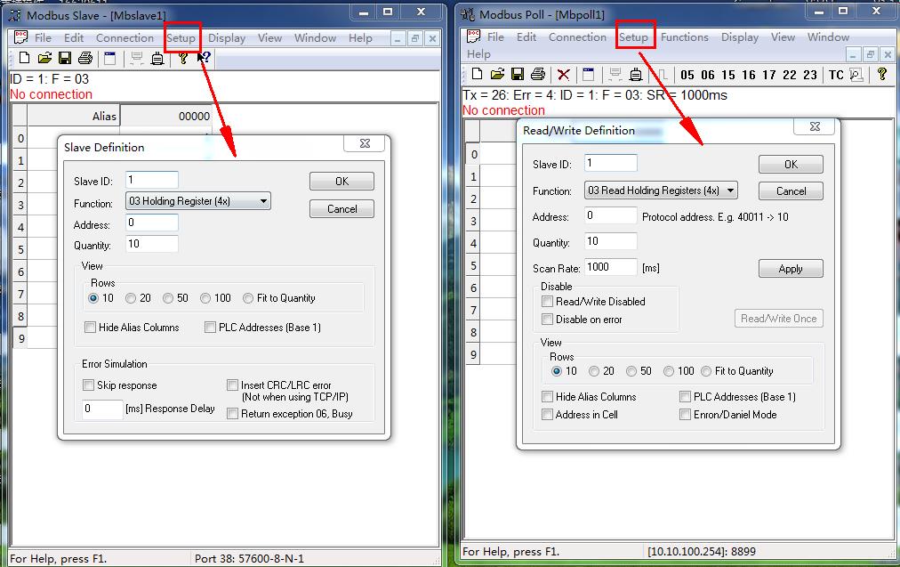 打開MODBUS pOLL軟件,設置MODBUS TCp,Ip填B2模塊的Ip 10.10.100.254,服務器的端口填8899。配置好3個時間參數。
