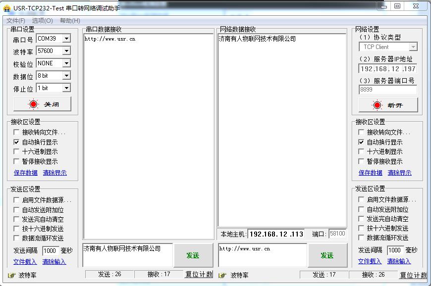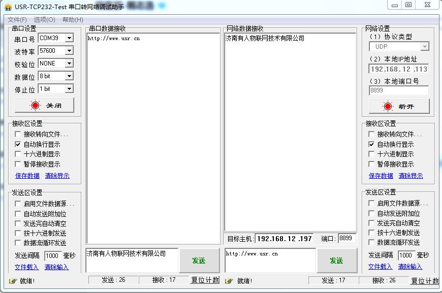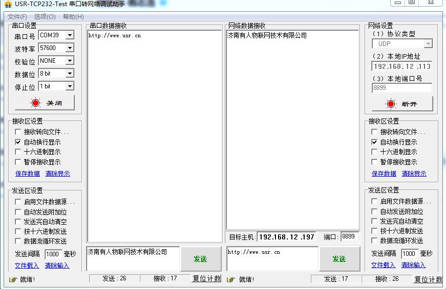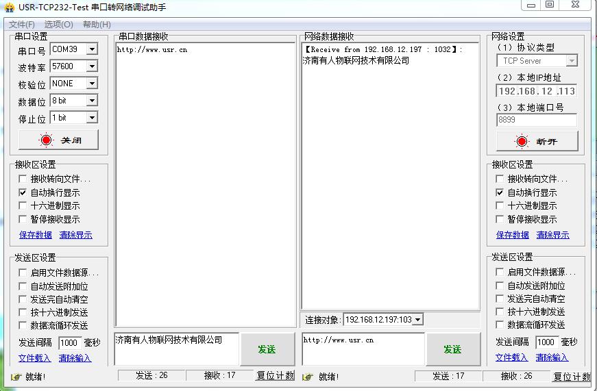 在電腦上用USR-TCp232-TEST軟件測試,打開COM口,網絡端設置參數。