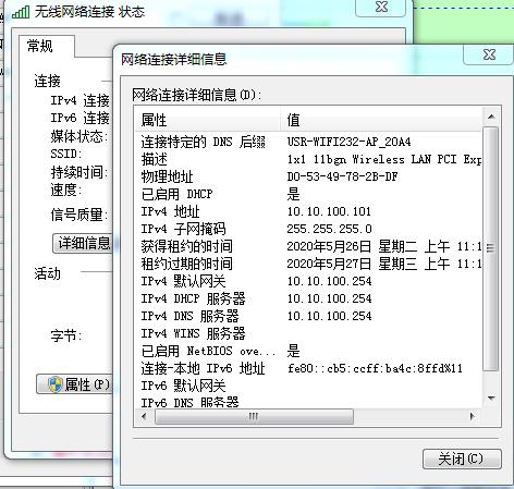 可以通過無線網絡連接,去查看狀態,點擊詳細信息,就可以看到電腦連接USR-WIFI232-B2,電腦的Ip是10.10.100.101。