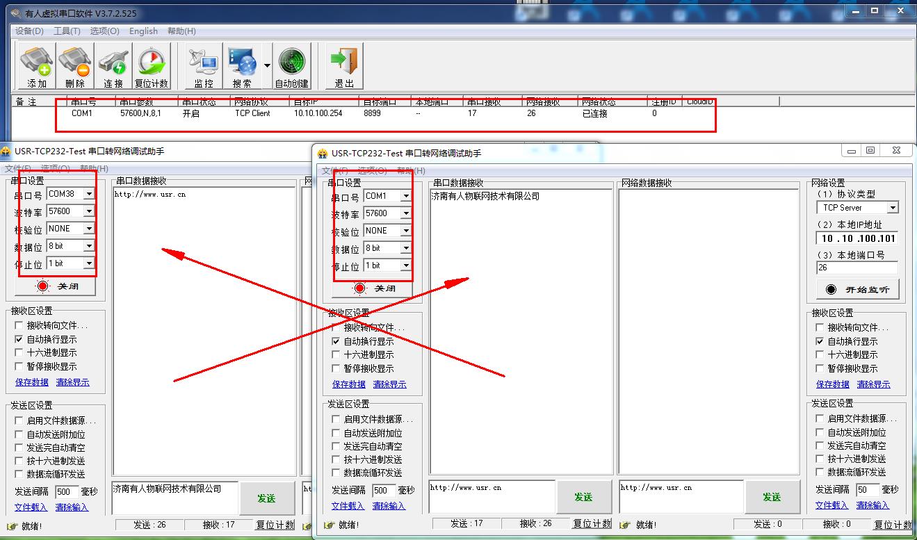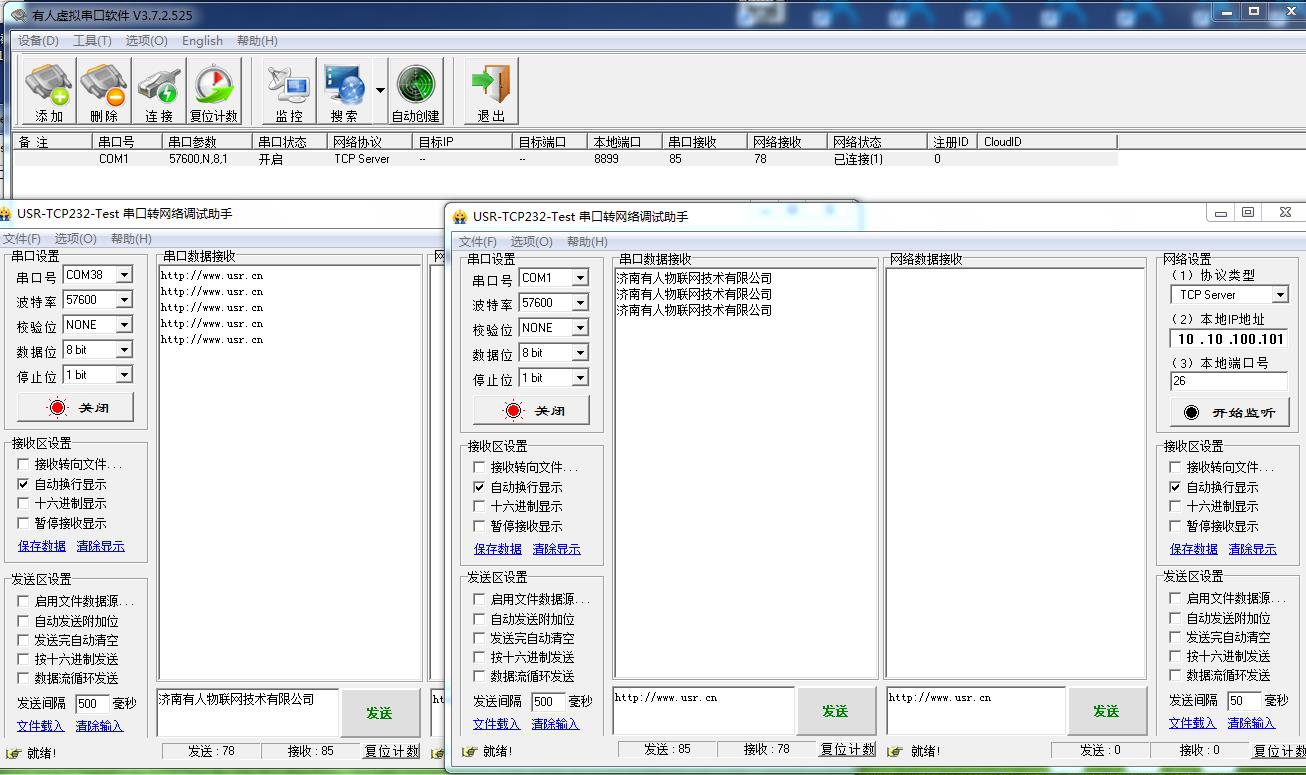 然后用兩個USR-TCp232-TEST測試串口和虛擬串口之間的數據傳輸。