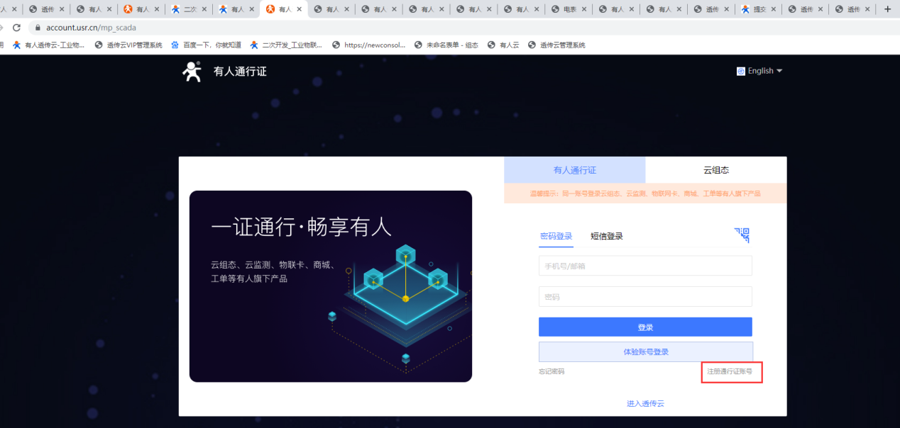 4、可以重新創建云組態,如果以前使用過透傳云可以直接綁定透傳云的賬號,由此界面綁定物聯網卡平臺,工單系統,云檢測,和商城。
