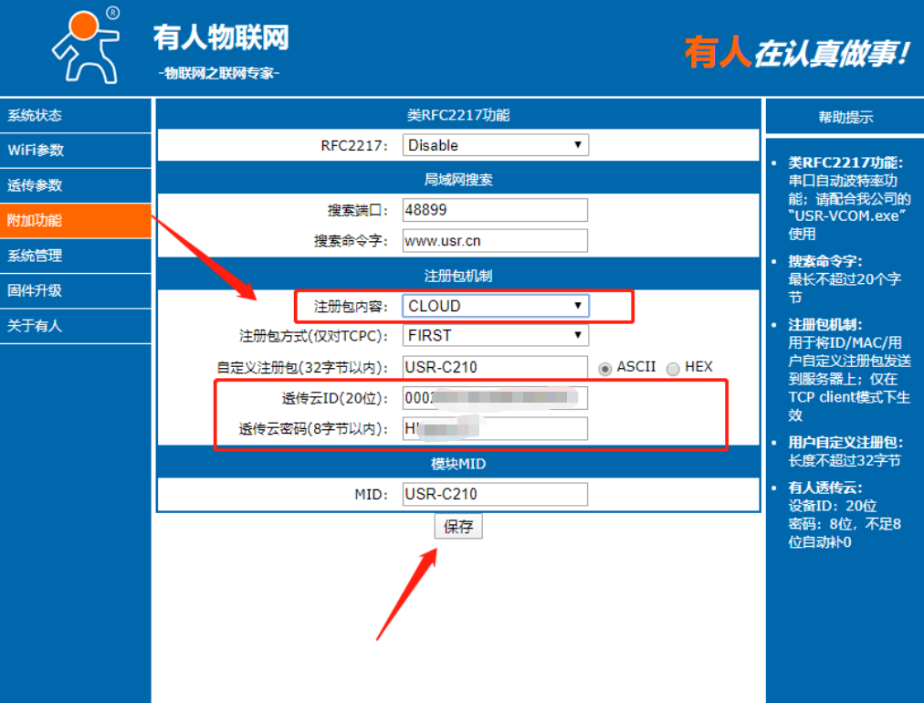 14、進入附加功能,注冊包選擇透傳云,填上透傳云上新建立的設備id,和密碼(如下圖所示),點擊保存。