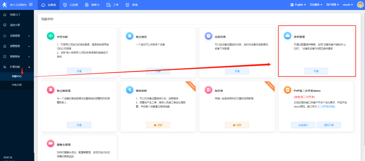 18、在“擴展功能”-“功能中心”選擇開通“透傳管理”功能;