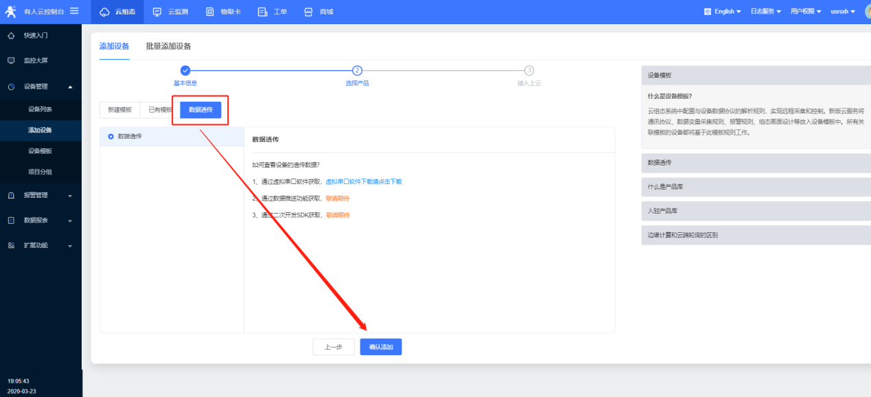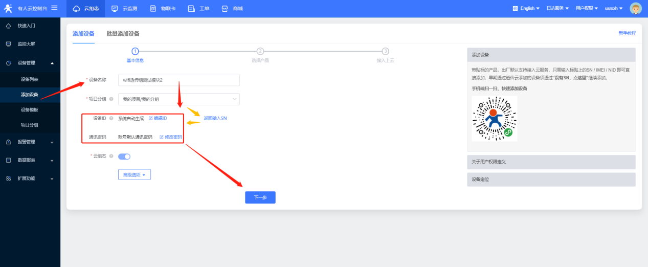 9、再次添加設備,名稱設置“wifi透傳組測試模塊”,設備ID與通信密碼自動生成后點擊“下一步”后,選擇“數據透傳”,確認添加。