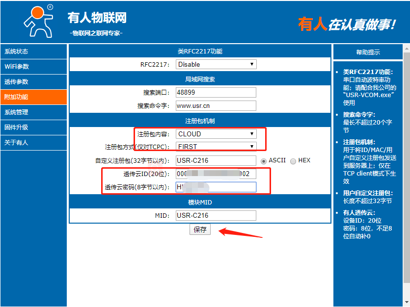 14、進入附加功能,注冊包選擇透傳云,填上透傳云上新建立的設備id,和密碼(如下圖所示),點擊保存。