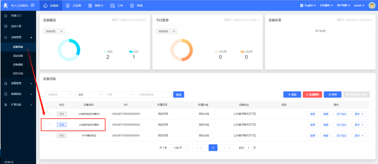16、依據第11~15步,讓第二個wifi模塊入網,第二個模塊的設備ID與通訊密碼填寫位透傳云模塊2的SN與密碼,配置完模塊重啟, 第二個模塊在云端顯示上線。