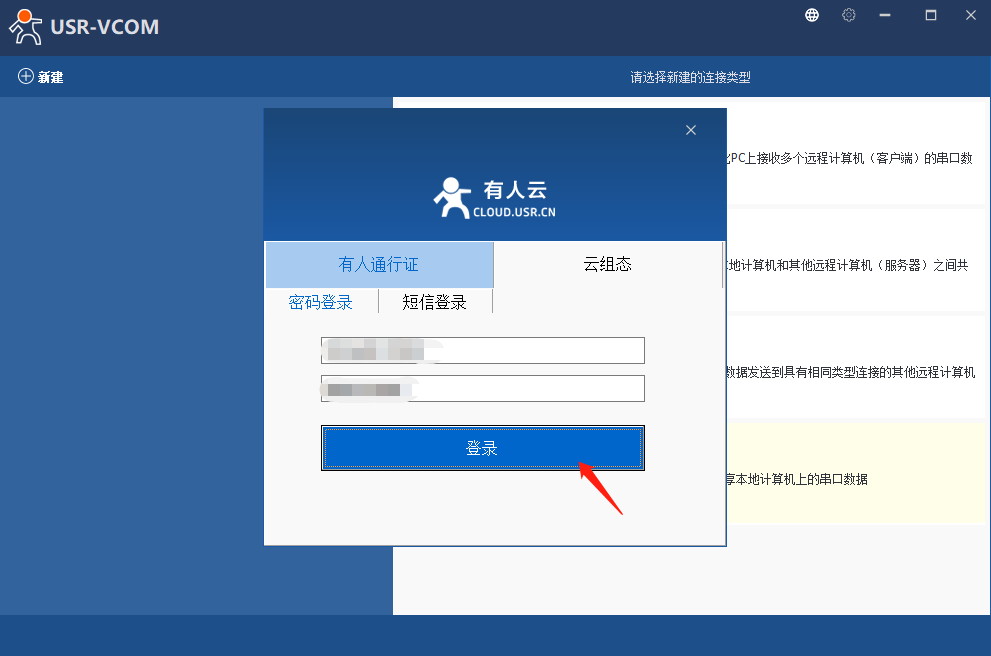 打開虛擬串口軟件,點擊新建云設備-Vircom連接。在跳出的登錄頁面登錄自己的有人云賬號。